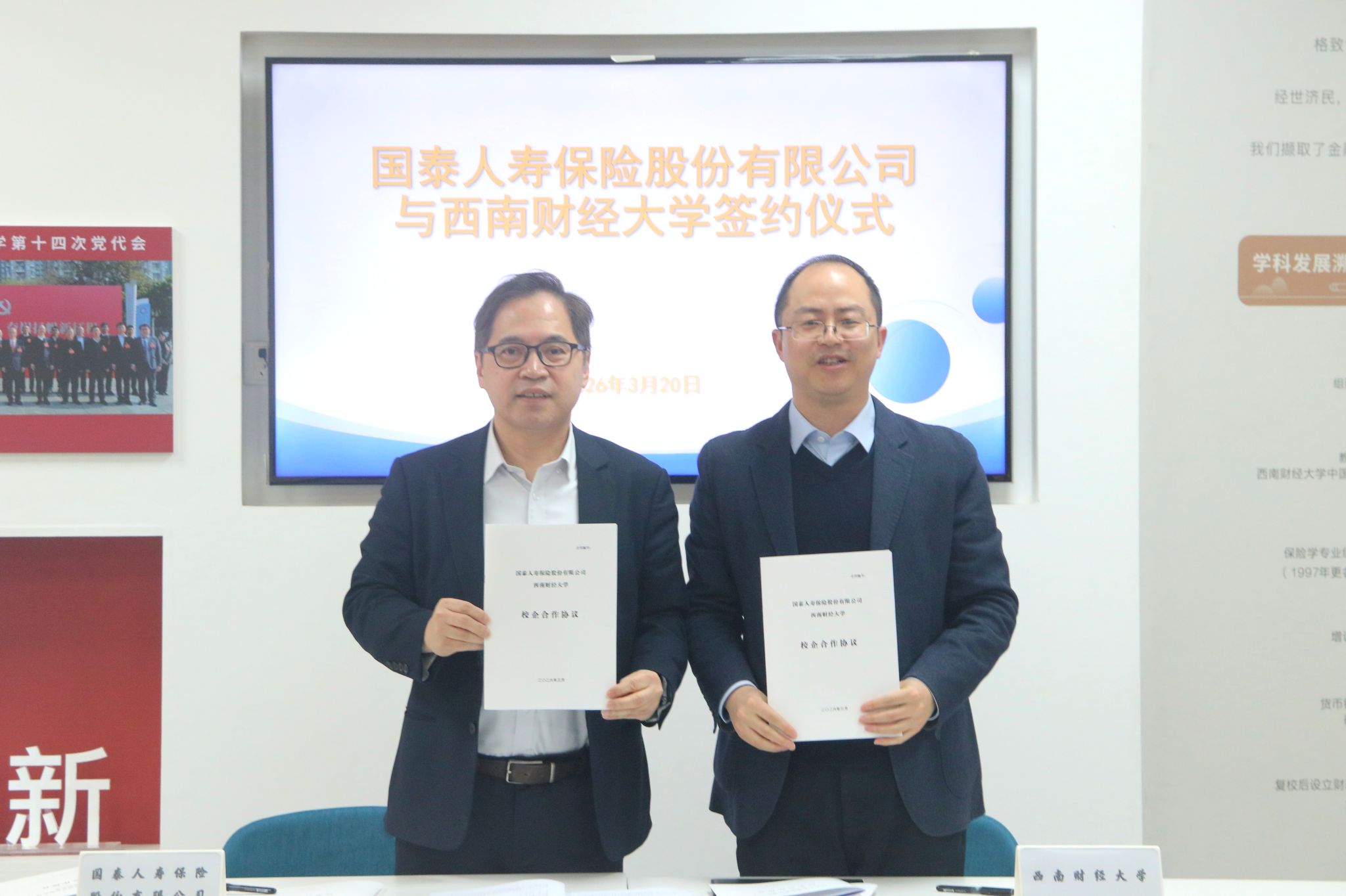 仪式上,双方签署《国泰人寿保险股份有限公司与西南财经大学校企合作协议》《国泰人寿保险股份有限公司“国泰春雨”奖教学金捐赠协议书》。参会人员围绕人才协同培养方案、联合课题研究、高端论坛、实习基地建设、奖教学金设立等具体合作内容座谈交流。